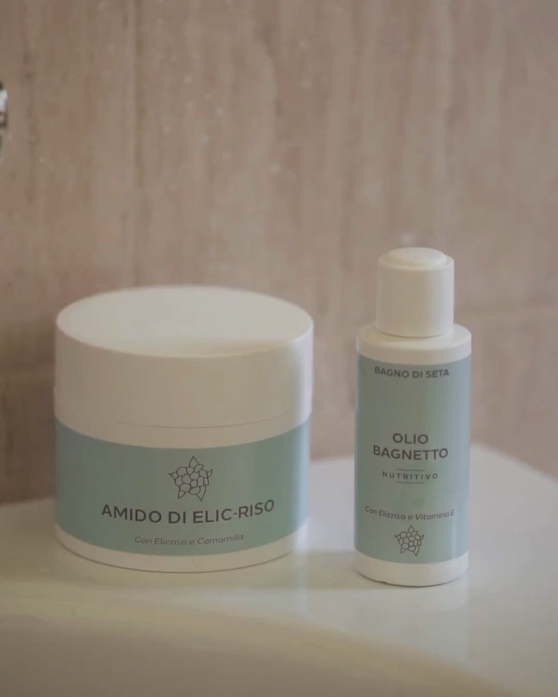 Una polvere 100 % naturale a base di amido di riso potenziato con estratto di Elicriso e fiori lenitivi (camomilla, calendula, malva) studiata per calmare e proteggere la pelle sensibile durante il bagnetto
