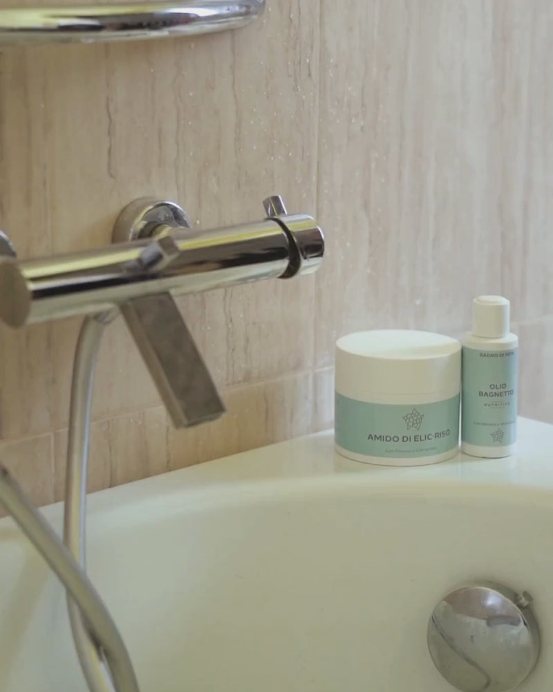 Sì: aggiungi l’amido per un effetto seta extra nella vasca o usa Doccia Polvere dopo l’olio se preferisci una leggera schiuma.